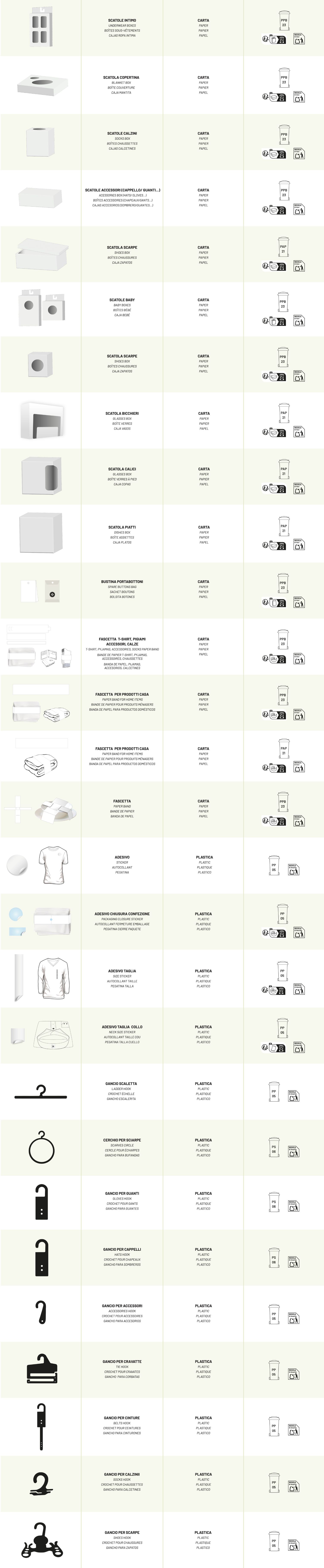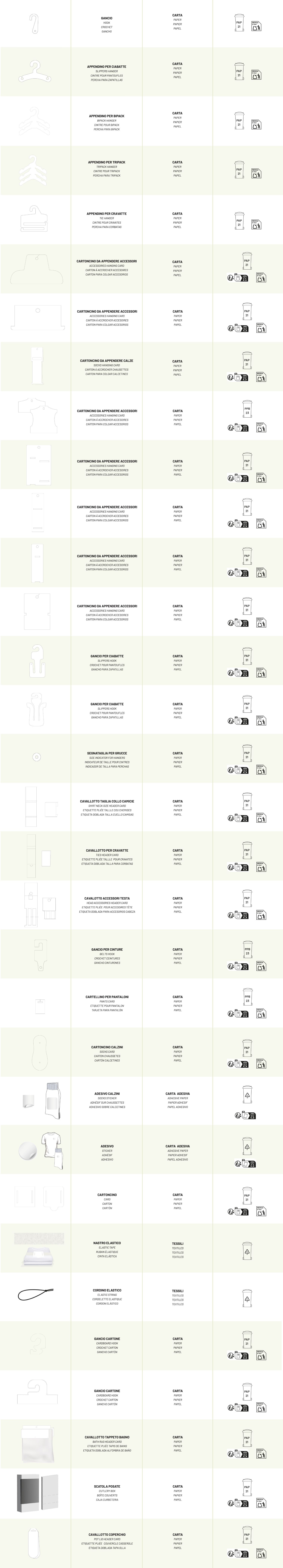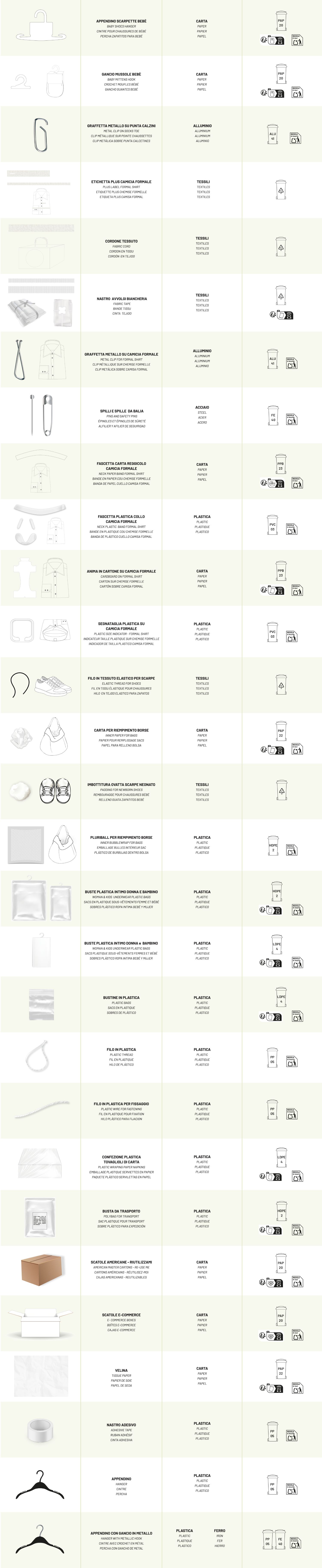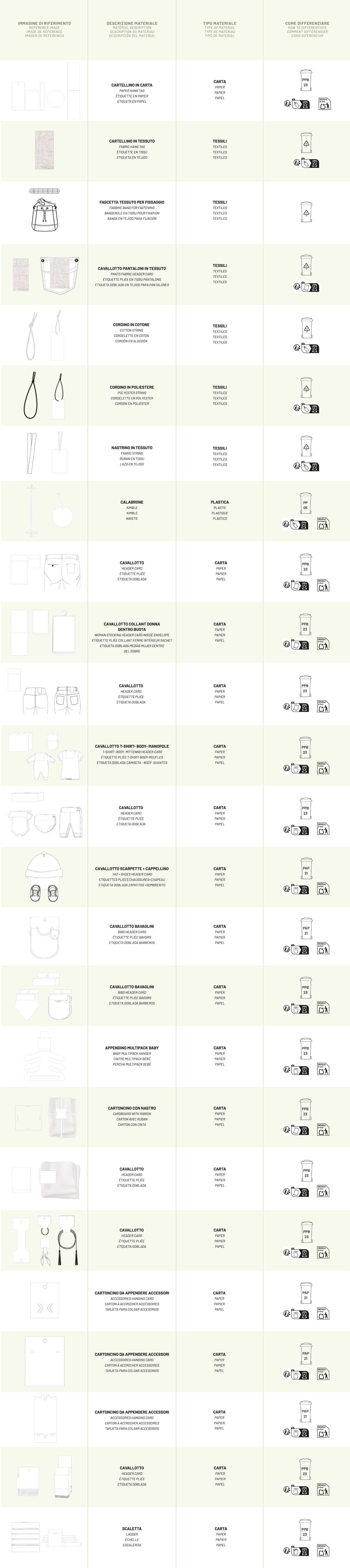 En las siguientes tablas encontrará información útil para la correcta eliminación de los materiales accesorios utilizados para embalar y exponer los productos de las marcas del grupo OVS S.p.A.