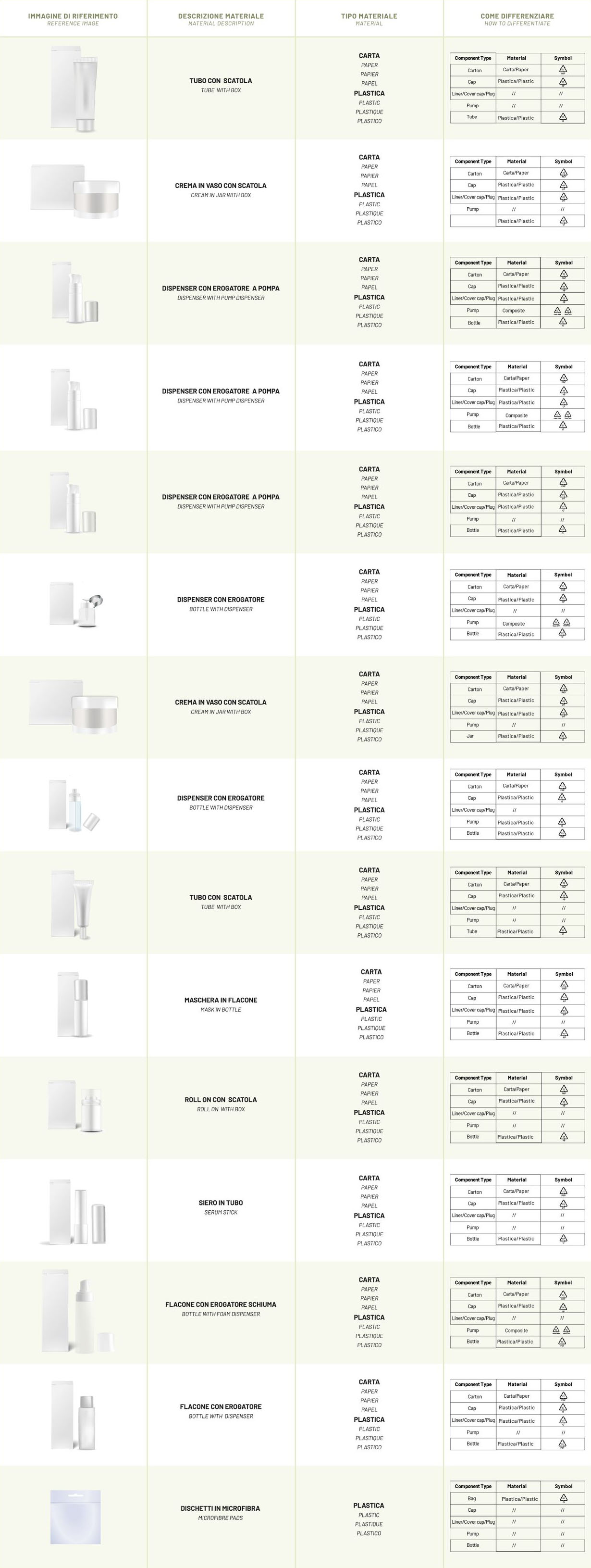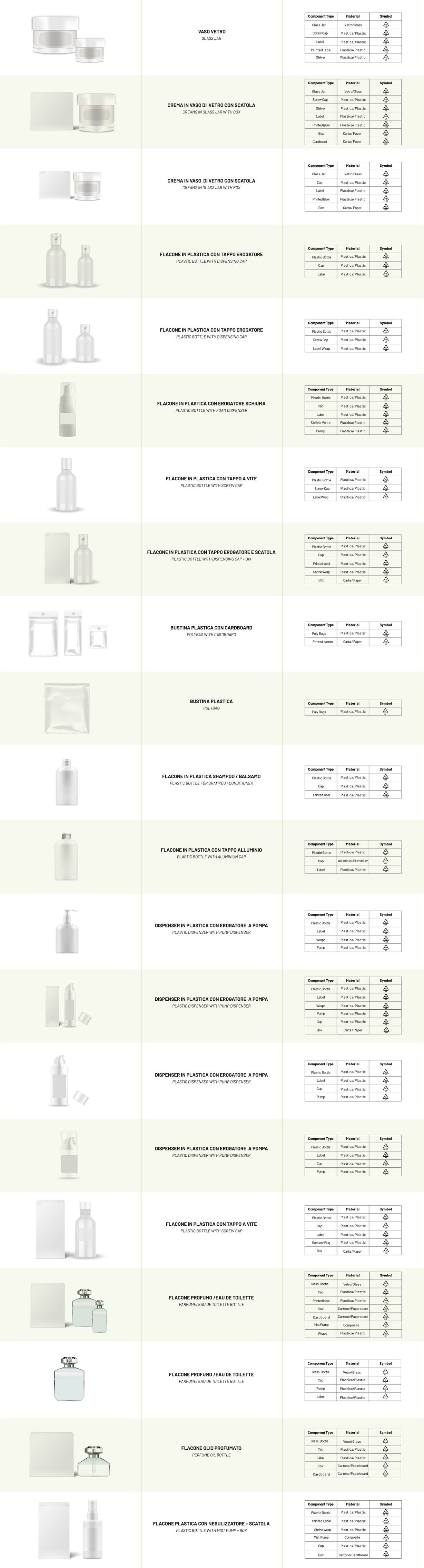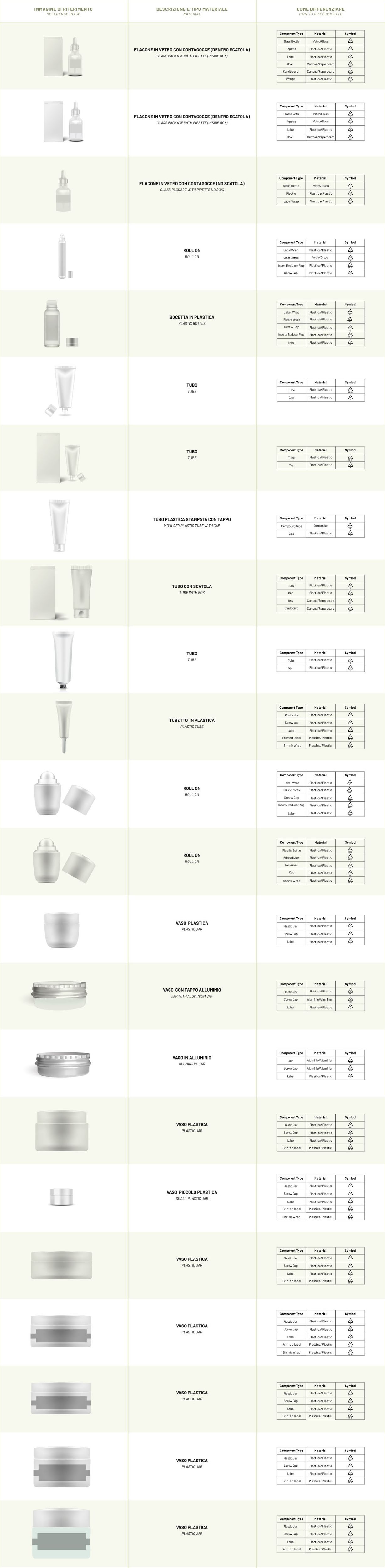 Per ogni tipologia di imballaggio, identificata sia da un'immagine di riferimento, sia da una descrizione del tipo di imballaggio/materiale, trovi indicati il tipo di materiale che costituisce l'imballaggio e la relativa sigla Europea dettata dalla Decisione 97/129/CE.