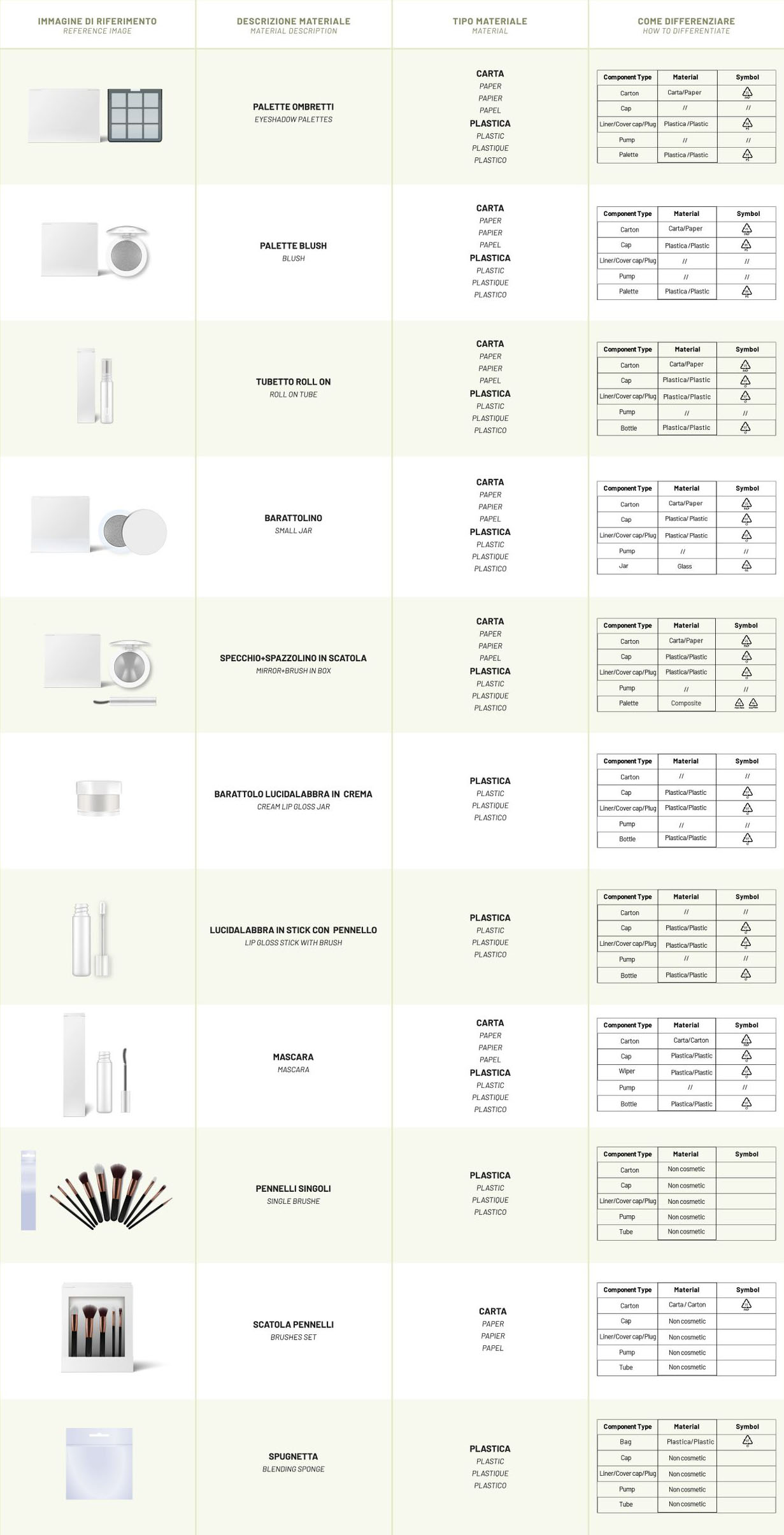 Nelle tabelle che seguono trovi informazioni utili a un corretto smaltimento dei materiali accessori utilizzati per l'imballaggio e l'esposizione dei prodotti dei marchi del gruppo OVS S.p.A.