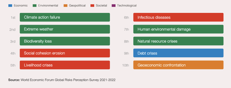 A conferma dell’urgenza, i principali rischi globali individuati nel 2022 dal World Economic Forum (WEF) sono rischi ambientali, con particolare riferimento alla crisi climatica e alla perdita di biodiversità, sia nel breve sia nel lungo periodo.
